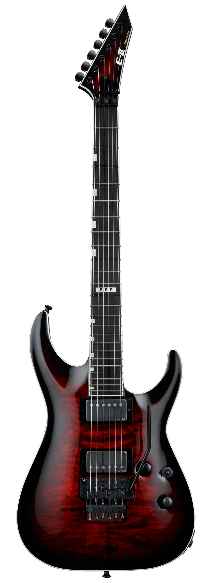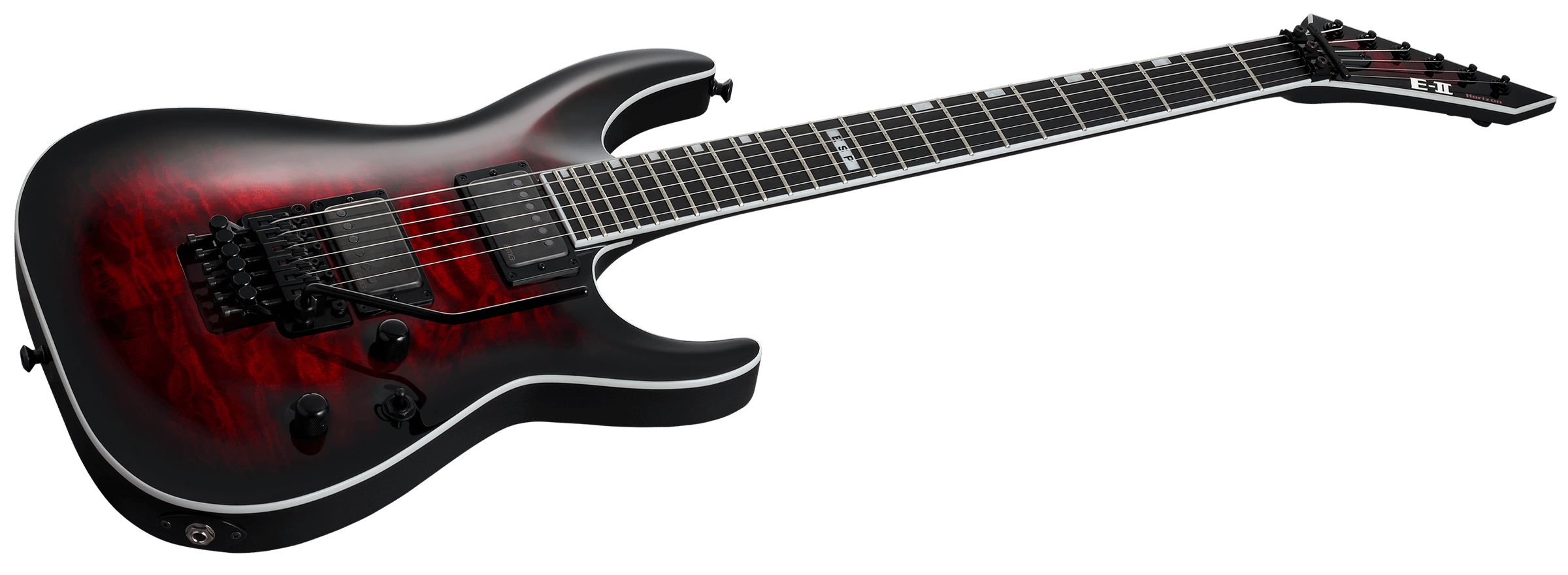 E-II Horizon FR-II имеет сквозную конструкцию грифа с корпусом из красного дерева и арочным топом из стеганого клена, а также кленовый гриф их трех частей с накладкой из черного дерева, 24 ладами из нержавеющей стали Extra Jumbo и инкрустациями в виде блоков, а также матовым покрытием на задней стороне для невероятно комфортной игры. Эта гитара оснащена высококачественными компонентами, включая тремоло Floyd Rose Original, замковые колки Gotoh и стреплоки ESP. На гитаре E-II Horizon FR-II установлены звукосниматели EMG 66TW (нек) и EMG 57TW (бридж), оба с крышками из матового черного хрома и функцией разделения катушек с помощью переключателей push-pull на регуляторах громкости и тона. В комплекте жесткий кейс ESP, идеально подходящий по форме гитаре.