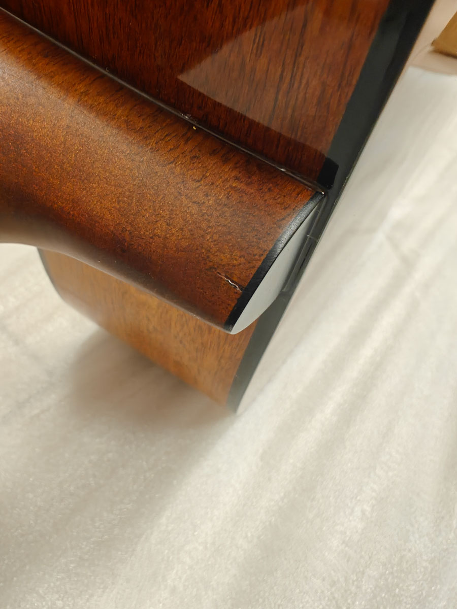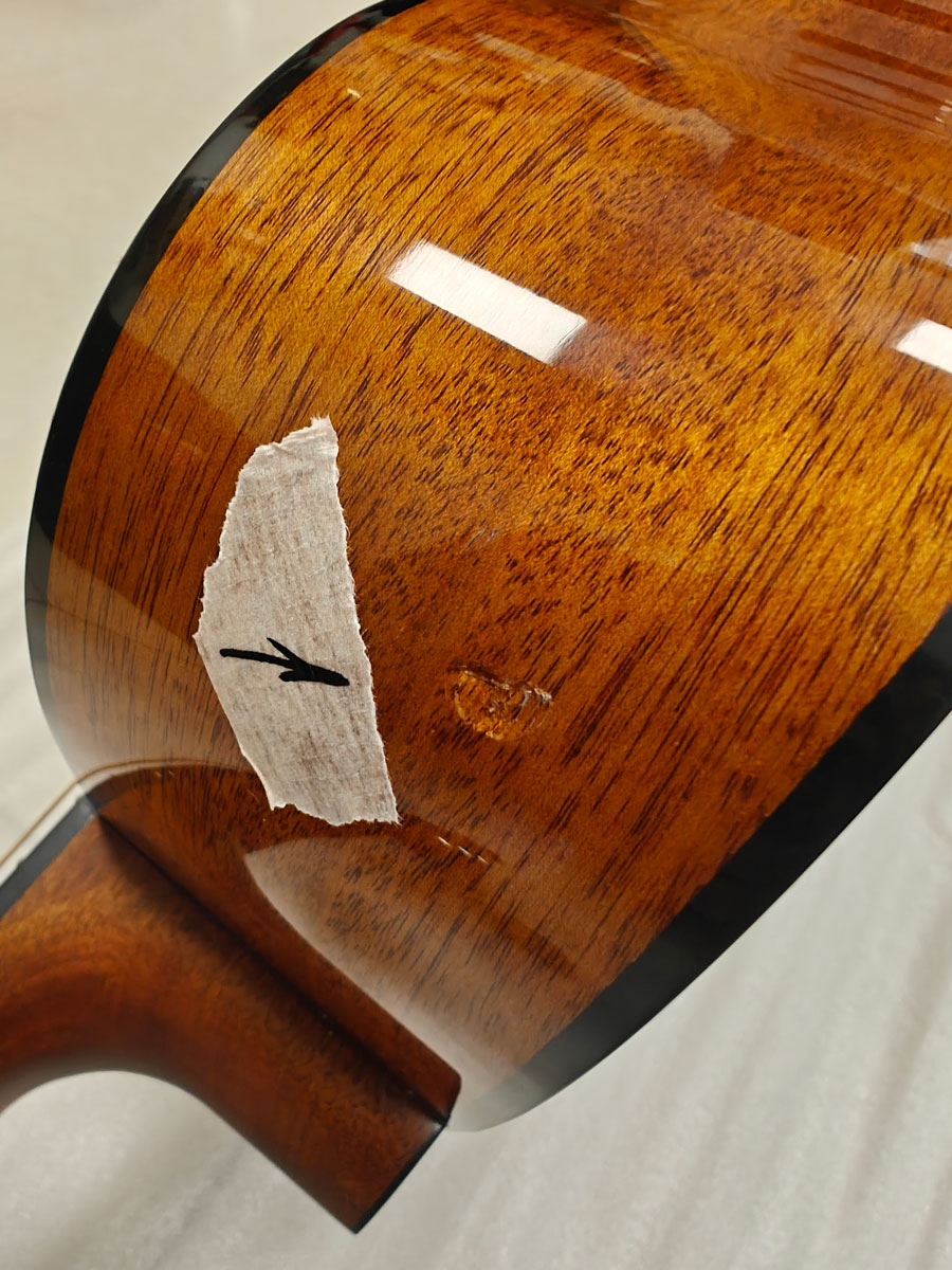 Пошкодженні під лаком на обичайці, незначний дефект на п"ятці грифу.